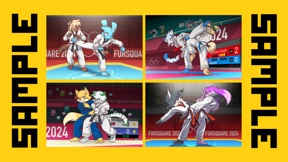Four types of postcards showing fighting techniques in each martial art. We also include the text that explains how we came up with the idea for each piece of art.