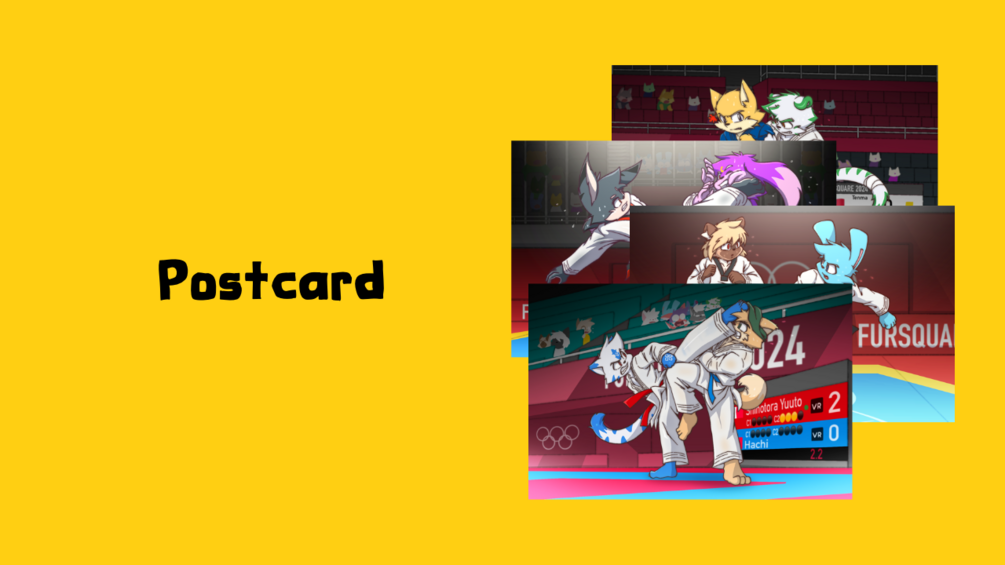 Four types of postcards showing fighting techniques in each martial art. We also include the text that explains how we came up with the idea for each piece of art.